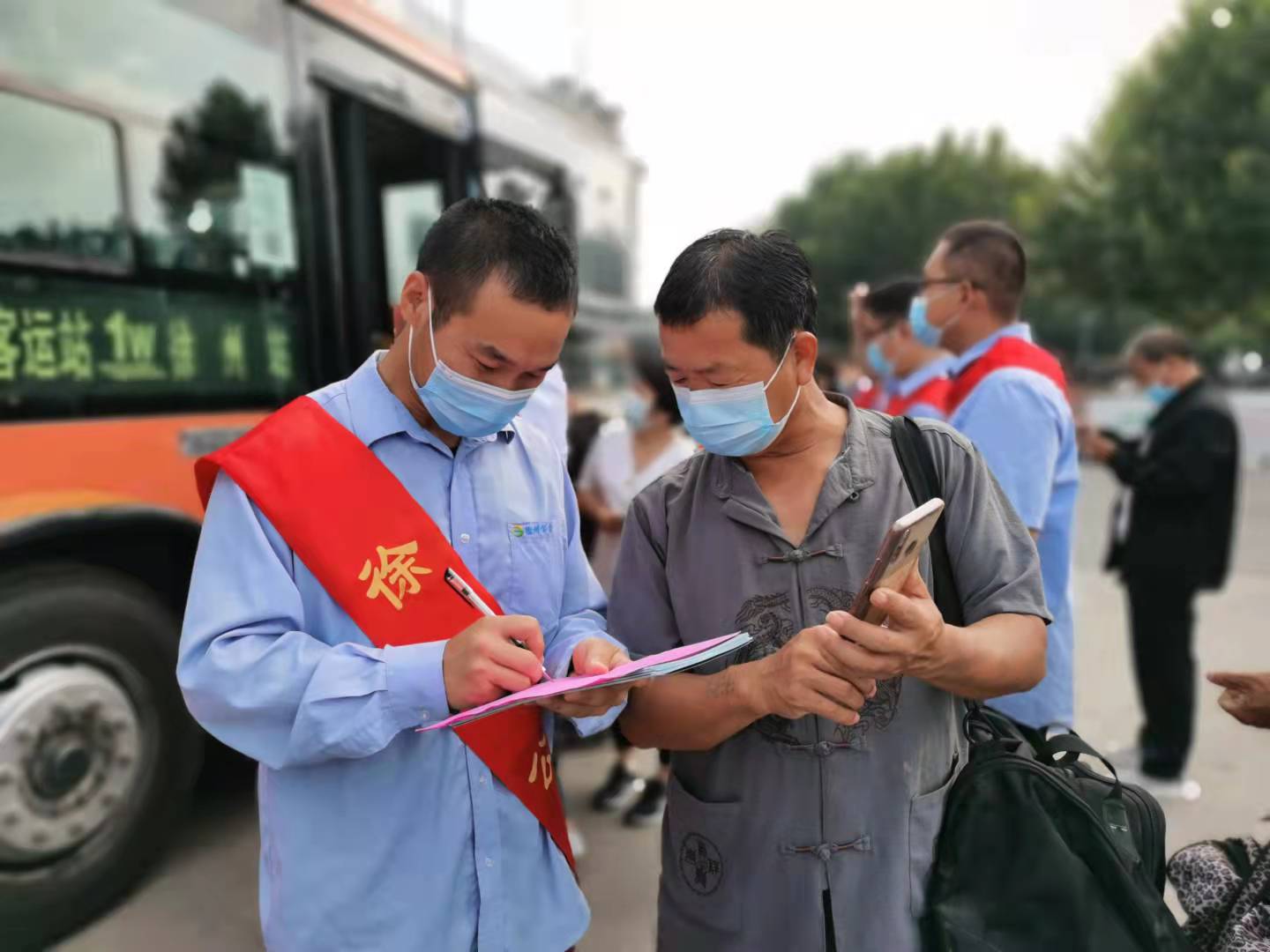 在活動(dòng)現(xiàn)場(chǎng),志愿者們積極行動(dòng),一邊引導(dǎo)車輛規(guī)范進(jìn)站,一邊疏導(dǎo)乘客有序上下車,解答乘客提問,并幫助乘客調(diào)取健康碼行程碼,方便市民乘車。