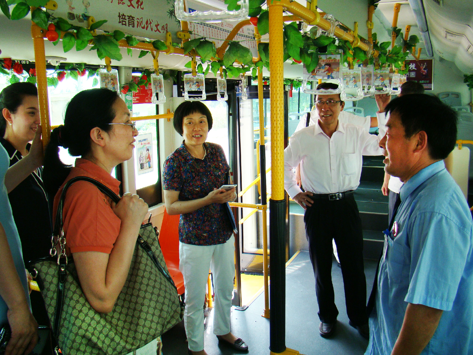 為有效提高老年人乘車安全系數(shù),公司為14路線在車廂內(nèi)設(shè)置“老幼病殘?jiān)小睈坌膶W幕A(chǔ)上,專門設(shè)置了“敬老專座”; 為了給老年乘客提供優(yōu)美的乘車環(huán)境,還在車廂的頂部和前部放置各種綠色植物和鮮花,同時(shí),在駕駛座后面安裝了便民袋,配備常用藥物、老花鏡、針線包、意見簿及公交乘車指南、報(bào)紙、老年人專用雨披等物,讓老年乘客登上公交車,就能感受到清新氣息。