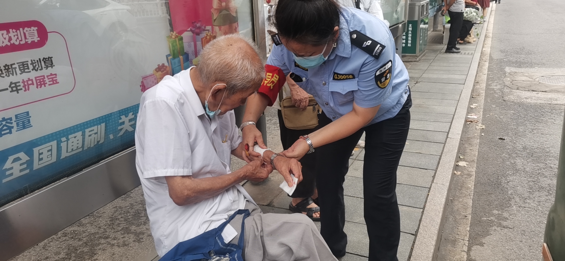 8月2日上午8時(shí)許,公交督導(dǎo)員孫琪在朝陽(yáng)站開展站臺(tái)執(zhí)勤工作時(shí),突然聽到有人大喊:“快來救一下,有人摔倒了!”孫琪當(dāng)即上前查看情況,發(fā)現(xiàn)一位老人癱坐在站臺(tái)上,不停地喘著粗氣,胳膊上有一個(gè)大傷口,鮮血直流。
