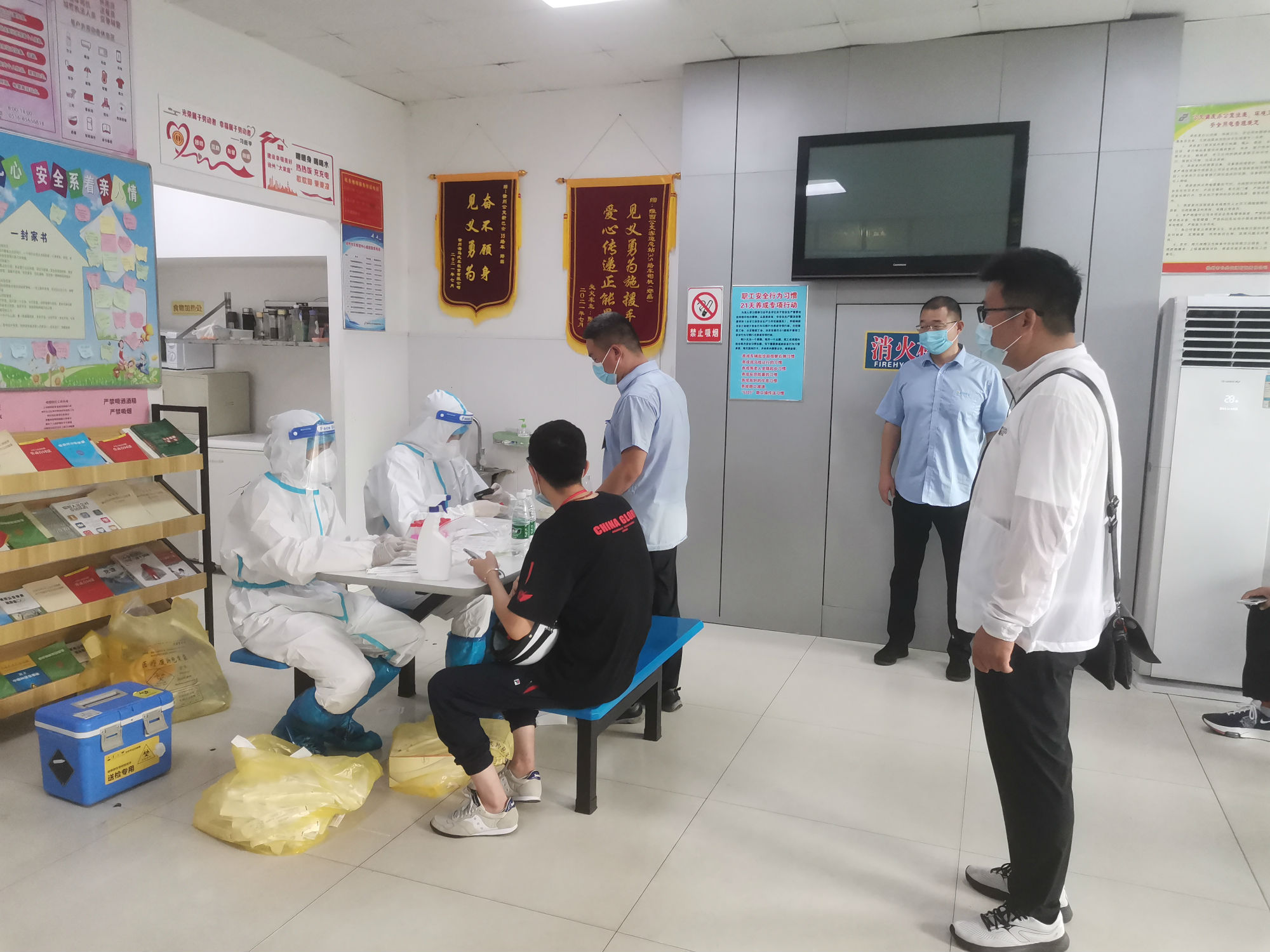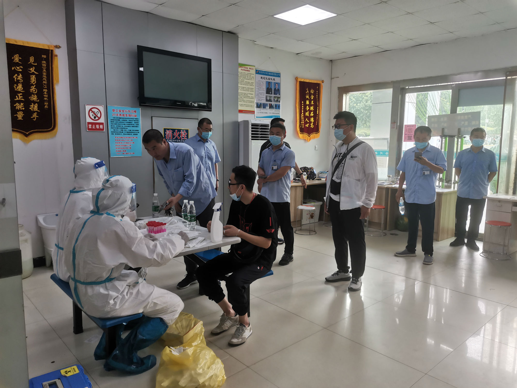 核酸檢測期間,新巴士公司各級管理人員做好后勤保障工作,經過亮碼認證、衛(wèi)生消毒、信息核對等程序后,職工才被獲準進入核酸采集室。同時,公司將空間較大的淮西客運站調度室作為采集點,并安排專職人員維持現場秩序。