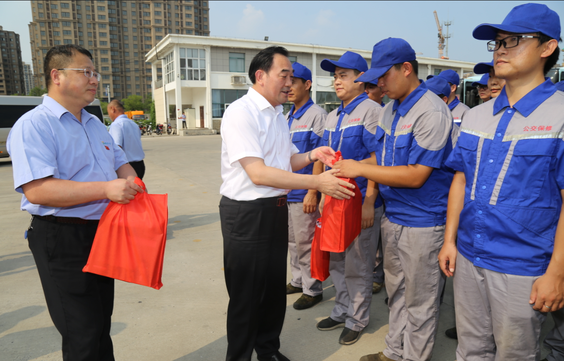 在烈日下的公交郭莊停車場,周鐵根書記看到堅守崗位的公交員工們汗流浹背,親切地上前與公交駕駛員、修理人員等一線員工一一握手?!按蠹倚量嗔耍「兄x你們!”他對廣大公交員工為保障全市人民高溫天氣正常出行所付出的辛勤勞動表示充分肯定,又將洗發(fā)水、毛巾、肥皂等降暑物品,以及《安全生產(chǎn)知識職工普及讀本》等書一一送到公交員工手中,叮囑有關負責人,要多愛護、關心一線職工,切實做好防暑降溫措施,為公交員工創(chuàng)造好的工作條件,切實維護廣大職工的安康權(quán)益,確保高溫天里職工的身體健康和安全生產(chǎn),讓職工安全度夏、清涼度夏,真正感受到黨和政府的關懷、工會組織的關心和社會各界的關愛。他還關心地叮囑公交員工們要勞逸結(jié)合,做好高溫防護,保重身體,杜絕疲勞駕駛,確保安全行車,并希望大家更好地堅守崗位、服務群眾,為保障市民安全有序的出行環(huán)境,打造我市優(yōu)化營商環(huán)境、營造文明城市良好氛圍做出更大的貢獻。