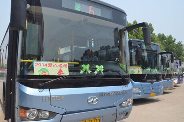 一年一度的高考是社會關(guān)注的熱點,每年這個時候,徐州的大街小巷都有這樣一個群體——送考愛心車隊。懸掛綠絲帶的送考車,成為城市道路上靚麗的風(fēng)景。今年,公司也加入到“愛心送考,算我一個”2014愛心送考公益活動中,在66路、76路、65路、11路、608路等5條途經(jīng)考點的線路成立“愛心公交”送考專線。高考期間,考生憑準考證可免費乘坐這5條線路。為了給考生提供力所能及的幫助,駕駛員還在車上配備了方便袋、清涼油、創(chuàng)可貼等用品,以備乘客不時之需。圖為“愛心送考”啟動儀式現(xiàn)場。